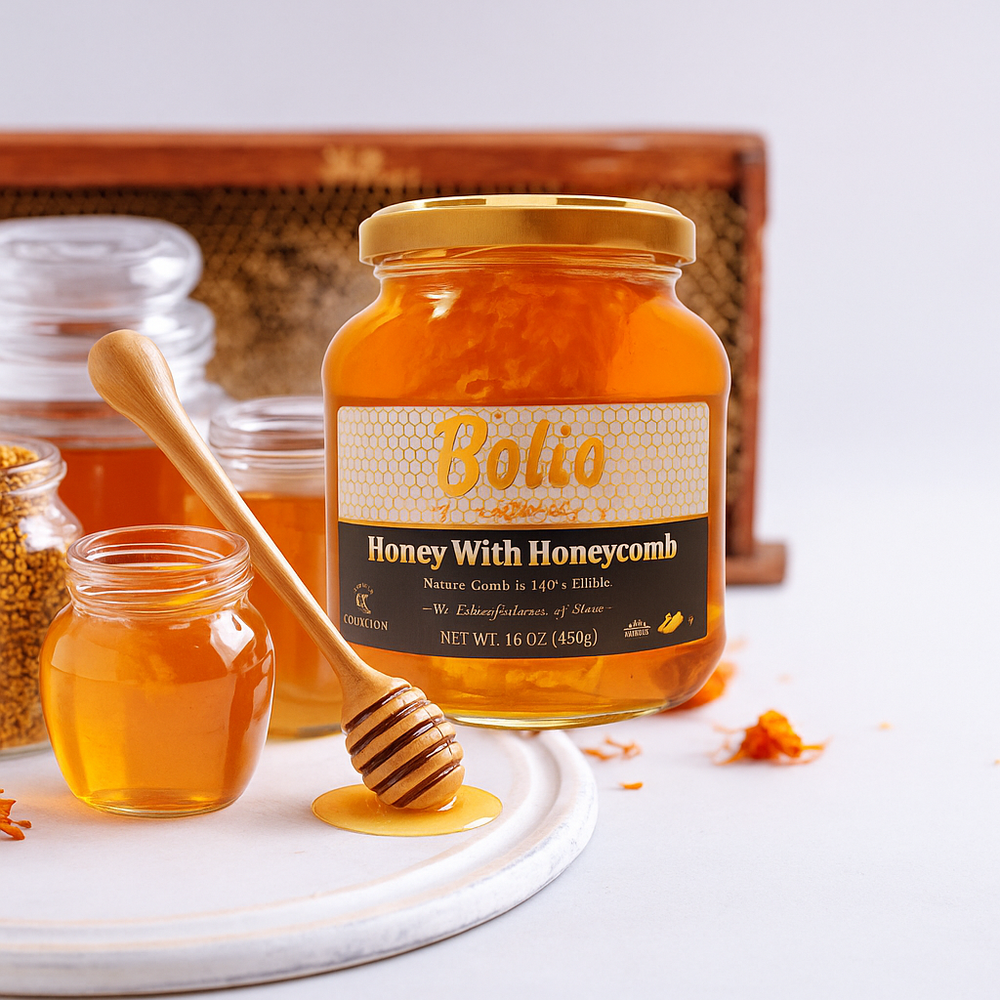 Experience the pure essence of nature with BOLIO's authentic honeycomb nestled in golden, raw honey. This 16-ounce glass jar contains genuine pieces of natural honeycomb suspended in unprocessed honey, delivering the ultimate farm-to-table sweetness.